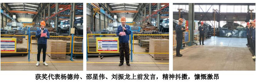 獲獎代表楊德帥、邵星偉、劉振龍上前發言,精神抖擻,慷慨激昂 劉總首先向獲獎員工表示祝賀,號召全體員工向獲獎人員學習,以先進為榜樣。劉總總結大干的數據成果及收效,在項目履約率、設備加工效率、機器人焊接及模具裝配等方面刷新了紀錄,實現了新突破。劉總強調“大干 60 天”的生產目標圓滿完成,離不開中層領導干部的努力拼搏,更離不開技術團隊、一線生產團隊朝出暮歸、不辭勞苦的辛勤付出。