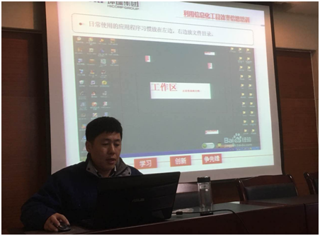 本次培訓由信息中心孟祥龍主任主講,孟主任從信息化設備硬件配置—系統優化—具體應用3個方面進行了詳細講解,重點針對信息化設備軟環境整理、整頓等進行了系統的講解,結合職能管理對信息化工具的應用等具體問題,由小見大,深入淺出,啟發引導,引導大家提升信息化使用效率,提升綜合素養。