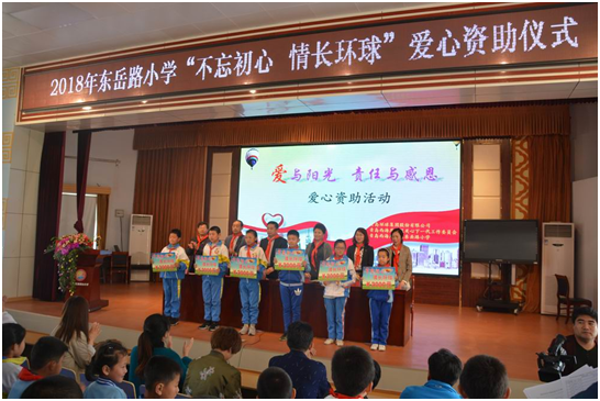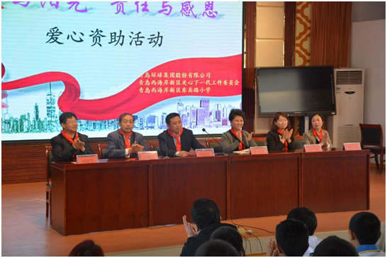 上午9時,愛心捐助儀式正式開始。環球集團副總經理尹郁武、黃島區關工委關愛幫扶工作團執行團長孫愛云、環球集團辦公室主任段菁、東岳路小學校領導和師生們共同參加了本次活動。